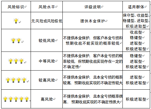 本产品为非保本浮动收益型理财产品,不保证本金和收益,请您充分认识投资风险,谨慎投资。本期产品期限为184天(中国建设银行有权对产品进行展期或提前终止),存续期内,产品不接受申购或赎回申请。本期产品内部风险评级级别为三盏警示灯 ,风险水平属于中等风险。最不利情况下,您将损失全部收益甚至包括全部本金。本理财产品适用于稳健型、进取型 、积极进取型客户。