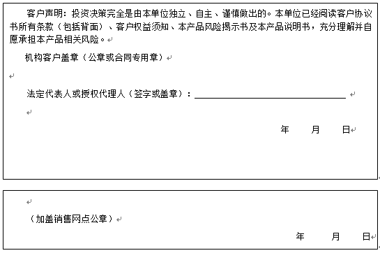 客户签名: ( 客户声明:投资决策完全是由客户独立、自主、谨慎做出的。客户已经阅读客户协议书所有条款(包括背面)、客户权益须知、本产品风险揭示书及本产品说明书,充分理解并自愿承担本产品相关风险。)