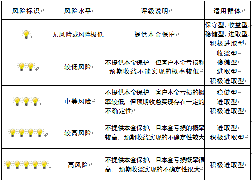 本产品为非保本浮动收益型理财产品,不保证本金和收益,请您充分认识投资风险,谨慎投资。本期产品期限为93天(中国建设银行有权对产品进行展期或提前终止),存续期内,产品不接受申购或赎回申请。本期产品内部风险评级级别为二盏警示灯 ,风险水平属于较低风险。最不利情况下,您将损失全部收益甚至包括全部本金。本理财产品适用于收益型、稳健型、进取型 、积极进取型客户。