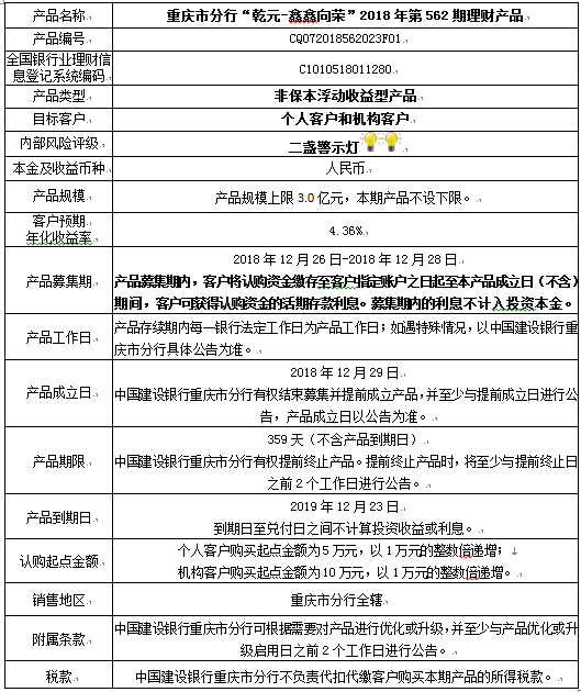 3.中国建设银行重庆市分行可根据市场情况等调整产品规模上、下限,并最迟于调整规模上下限当日进行公告。