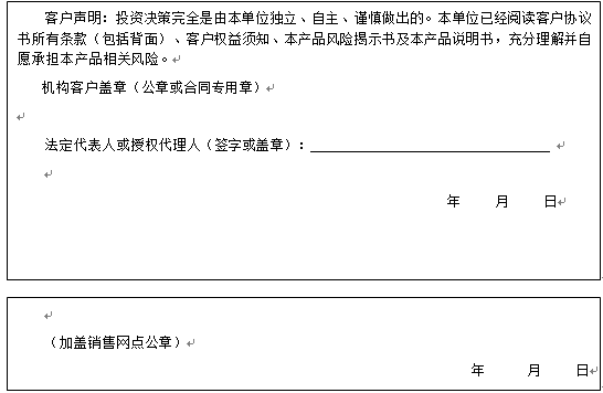 客户签名: ( 客户声明:投资决策完全是由客户独立、自主、谨慎做出的。客户已经阅读客户协议书所有条款(包括背面)、客户权益须知、本产品风险揭示书及本产品说明书,充分理解并自愿承担本产品相关风险。)