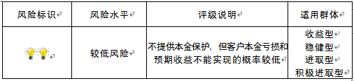 本产品为封闭式净值型理财产品,不保证本金和收益,请您充分认识投资风险,谨慎投资。本产品任何业绩比较基准、测算收益或类似表述均属不具有法律约束力的用语,不代表客户可能获得的实际收益,亦不构成中国建设银行重庆市分行对本产品的任何收益承诺。产品期限为固定期限(中国建设银行重庆市分行有权提前终止产品),存续期内产品不接受赎回申请。 本期产品内部风险评级级别为二盏警示灯 ,风险程度属于较低风险,适用于收益型、稳健型、进取型和积极进取型客户。最不利情况下,本期产品投资的资产无法回收任何本金和净收益,客户将损失全部本金。投资者不得使用贷款、发行债券等筹集的非自有资金投资本产品。如影响您风险承受能力的因素发生变化,请及时完成风险承受能力评估。