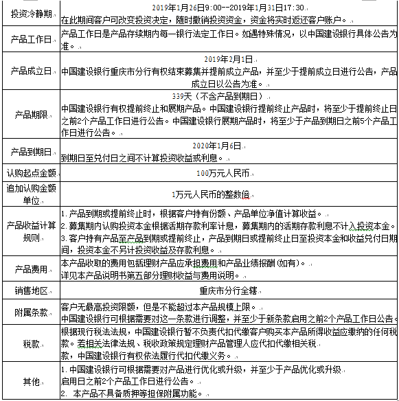 (一)中国建设银行重庆市分行通过中国建设银行网站(www.ccb.com)披露产品以下相关信息:在产品正常成立、产品终止、发生对产品产生重大影响之情形后的5个产品工作日内发布产品成立、产品终止、重大影响事件等信息;如中国建设银行拟调整产品规模上下限、调整业绩比较基准、调整投资范围、投资品种或投资比例、优化或升级产品、行使提前终止权,则需在调整规模上下限之日、新的业绩比较基准启用日、新的投资范围、投资品种或投资比例启用日、产品优化或升级启用日、提前终止日等相关日之前至少2个产品工作日进行公告;如中国建设银行拟调整本产品相关费用费率或延长产品期限,则需在费用费率调整日或产品到期日之前至少5个产品工作日进行公告;如发生产品到期时的延迟/分次兑付情形,则于该情形发生后的2个产品工作日内进行公告;产品存续期内,每季度首月前5个工作日内公布截至上季度末产品的资产净值、份额净值和其他重要信息;产品到期或提前终止后,在产品到期日或提前终止日(如遇非产品工作日,则顺延至下一个工作日)后的3个产品工作日内发布到期日或提前终止日的产品资产净值、份额净值和其他重要信息。