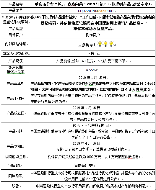 3.中国建设银行重庆市分行可根据市场情况等调整产品规模上、下限,并最迟于调整规模上下限当日进行公告。