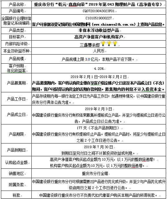 3.中国建设银行重庆市分行可根据市场情况等调整产品规模上、下限,并最迟于调整规模上下限当日进行公告。