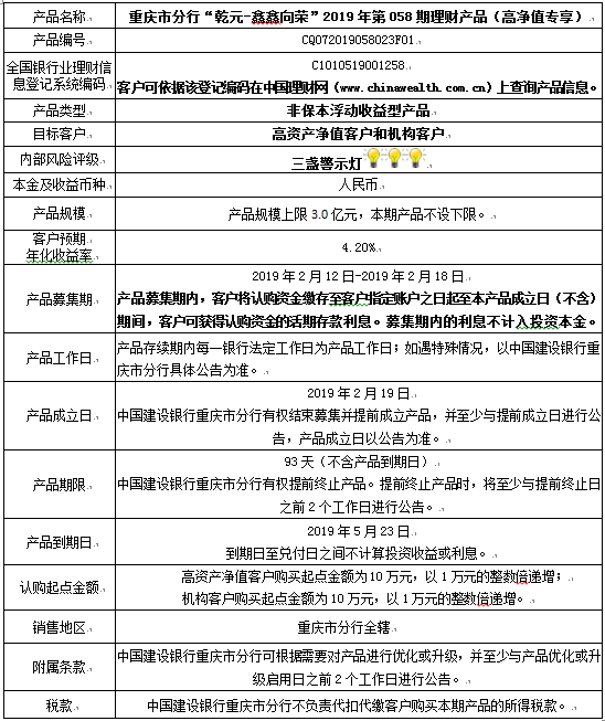 3.中国建设银行重庆市分行可根据市场情况等调整产品规模上、下限,并最迟于调整规模上下限当日进行公告。