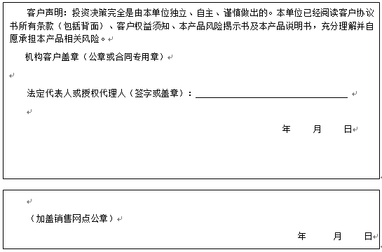 客户签名: ( 客户声明:投资决策完全是由客户独立、自主、谨慎做出的。客户已经阅读客户协议书所有条款(包括背面)、客户权益须知、本产品风险揭示书及本产品说明书,充分理解并自愿承担本产品相关风险。)