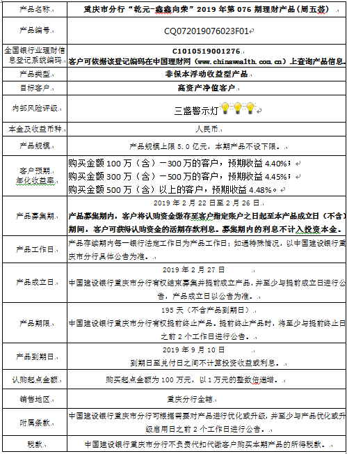 3.中国建设银行重庆市分行可根据市场情况等调整产品规模上、下限,并最迟于调整规模上下限当日进行公告。