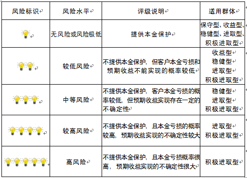 本产品为非保本浮动收益型理财产品,不保证本金和收益,请您充分认识投资风险,谨慎投资。本期产品期限为180天(中国建设银行有权对产品进行展期或提前终止),存续期内,产品不接受申购或赎回申请。本期产品内部风险评级级别为三盏警示灯 ,风险水平属于中等风险。最不利情况下,您将损失全部收益甚至包括全部本金。本理财产品适用于稳健型、进取型 、积极进取型客户。