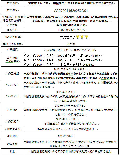 3.中国建设银行重庆市分行可根据市场情况等调整产品规模上、下限,并最迟于调整规模上下限当日进行公告。