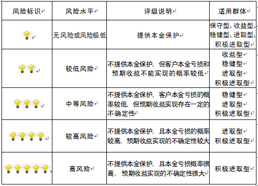 本产品为非保本浮动收益型理财产品,不保证本金和收益,请您充分认识投资风险,谨慎投资。本期产品期限为176天(中国建设银行有权对产品进行展期或提前终止),存续期内,产品不接受申购或赎回申请。本期产品内部风险评级级别为三盏警示灯 ,风险水平属于中等风险。最不利情况下,您将损失全部收益甚至包括全部本金。本理财产品适用于稳健型、进取型 、积极进取型客户。