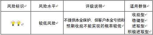 本产品为封闭式净值型理财产品,不保证本金和收益,请您充分认识投资风险,谨慎投资。本产品任何业绩比较基准、测算收益或类似表述均属不具有法律约束力的用语,不代表客户可能获得的实际收益,亦不构成中国建设银行重庆市分行对本产品的任何收益承诺。产品期限为固定期限(中国建设银行重庆市分行有权提前终止产品),存续期内产品不接受赎回申请。 本期产品内部风险评级级别为二盏警示灯 ,风险程度属于较低风险,适用于收益型、稳健型、进取型和积极进取型客户。最不利情况下,本期产品投资的资产无法回收任何本金和净收益,客户将损失全部本金。投资者不得使用贷款、发行债券等筹集的非自有资金投资本产品。如影响您风险承受能力的因素发生变化,请及时完成风险承受能力评估。