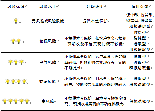 本产品为非保本浮动收益型理财产品,不保证本金和收益,请您充分认识投资风险,谨慎投资。本期产品期限为367天(中国建设银行有权对产品进行展期或提前终止),存续期内,产品不接受申购或赎回申请。本期产品内部风险评级级别为二盏警示灯 ,风险水平属于较低风险。最不利情况下,您将损失全部收益甚至包括全部本金。本理财产品适用于收益型、稳健型、进取型 、积极进取型客户。