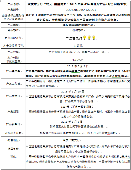 2019年第654期理财产品说明书