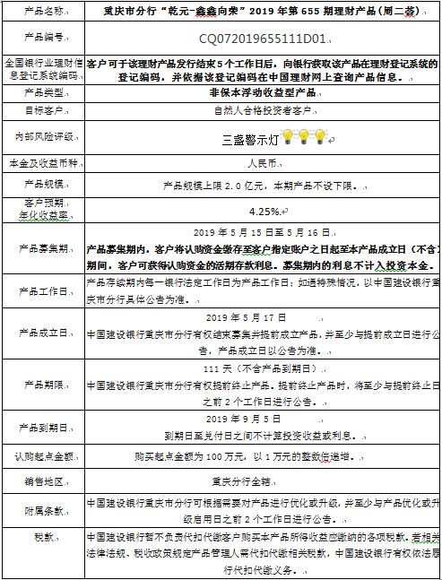 3.中国建设银行重庆市分行可根据市场情况等调整产品规模上、下限,并最迟于调整规模上下限当日进行公告。