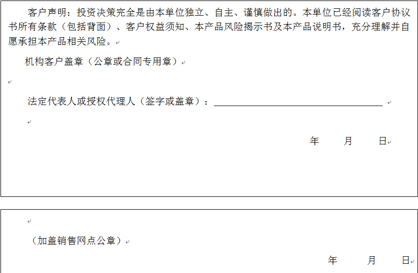 客户签名: ( 客户声明:投资决策完全是由客户独立、自主、谨慎做出的。客户已经阅读客户协议书所有条款(包括背面)、客户权益须知、本产品风险揭示书及本产品说明书,充分理解并自愿承担本产品相关风险。)