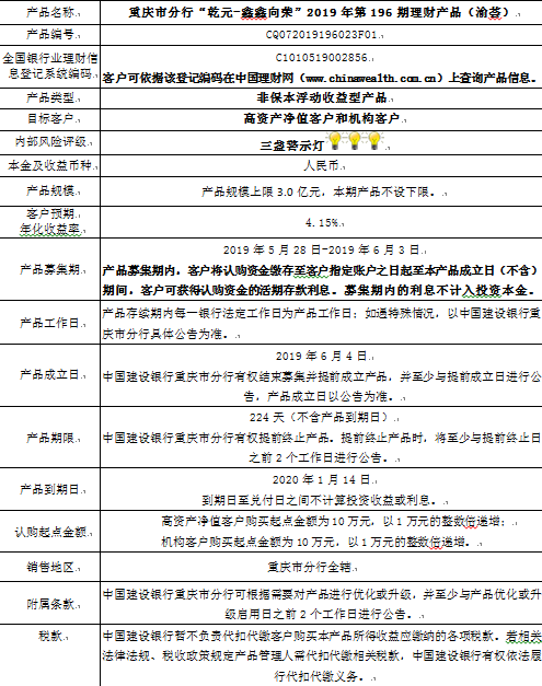 3.中国建设银行重庆市分行可根据市场情况等调整产品规模上、下限,并最迟于调整规模上下限当日进行公告。