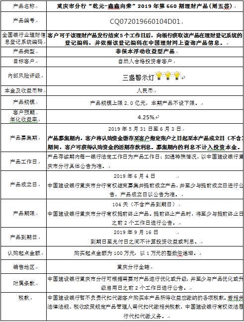 3.中国建设银行重庆市分行可根据市场情况等调整产品规模上、下限,并最迟于调整规模上下限当日进行公告。
