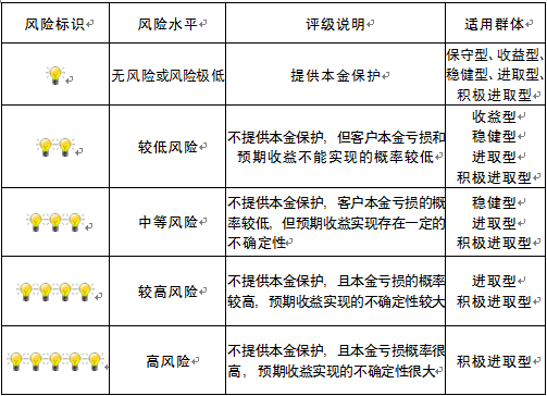 本产品为非保本浮动收益型理财产品,不保证本金和收益,请您充分认识投资风险,谨慎投资。本期产品期限为126天(中国建设银行有权对产品进行展期或提前终止),存续期内,产品不接受申购或赎回申请。本期产品内部风险评级级别为三盏警示灯 ,风险水平属于中等风险。最不利情况下,您将损失全部收益甚至包括全部本金。本理财产品适用于稳健型、进取型 、积极进取型客户。