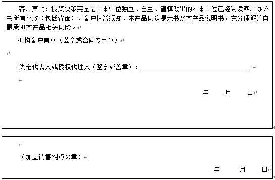 客户签名: ( 客户声明:投资决策完全是由客户独立、自主、谨慎做出的。客户已经阅读客户协议书所有条款(包括背面)、客户权益须知、本产品风险揭示书及本产品说明书,充分理解并自愿承担本产品相关风险。)