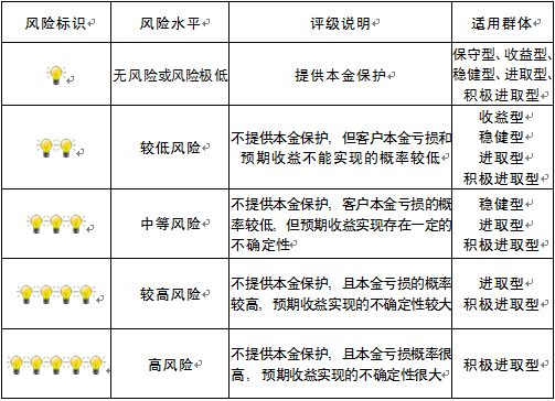 本产品为非保本浮动收益型理财产品,不保证本金和收益,请您充分认识投资风险,谨慎投资。本期产品期限为112天(中国建设银行有权对产品进行展期或提前终止),存续期内,产品不接受申购或赎回申请。本期产品内部风险评级级别为二盏警示灯 ,风险水平属于较低风险。最不利情况下,您将损失全部收益甚至包括全部本金。本理财产品适用于收益型、稳健型、进取型 、积极进取型客户。