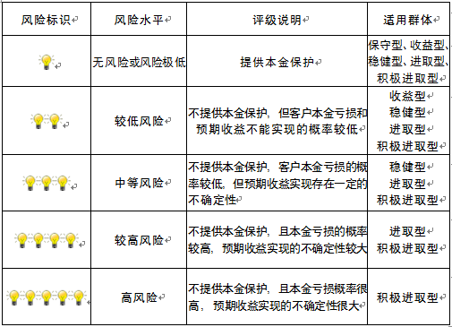 本产品为非保本浮动收益型理财产品,不保证本金和收益,请您充分认识投资风险,谨慎投资。本期产品期限为189天(中国建设银行有权对产品进行展期或提前终止),存续期内,产品不接受申购或赎回申请。本期产品内部风险评级级别为三盏警示灯 ,风险水平属于中等风险。最不利情况下,您将损失全部收益甚至包括全部本金。本理财产品适用于稳健型、进取型 、积极进取型客户。