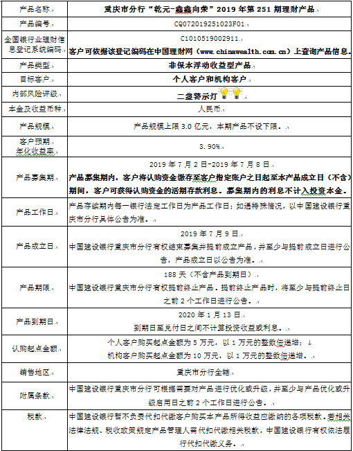 3.中国建设银行重庆市分行可根据市场情况等调整产品规模上、下限,并最迟于调整规模上下限当日进行公告。