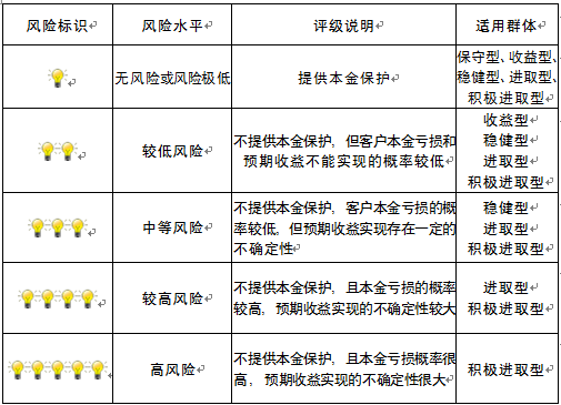 本产品为非保本浮动收益型理财产品,不保证本金和收益,请您充分认识投资风险,谨慎投资。本期产品期限为153天(中国建设银行有权对产品进行展期或提前终止),存续期内,产品不接受申购或赎回申请。本期产品内部风险评级级别为二盏警示灯 ,风险水平属于较低风险。最不利情况下,您将损失全部收益甚至包括全部本金。本理财产品适用于收益型、稳健型、进取型 、积极进取型客户。