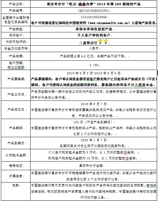 2019年第288期理财产品说明书