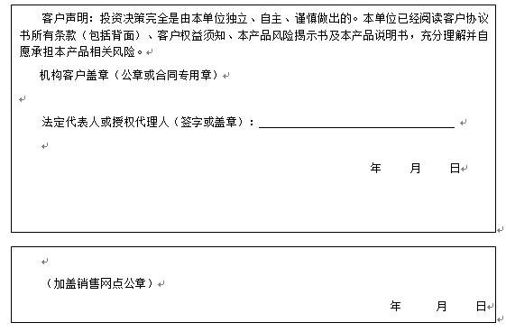 客户签名: ( 客户声明:投资决策完全是由客户独立、自主、谨慎做出的。客户已经阅读客户协议书所有条款(包括背面)、客户权益须知、本产品风险揭示书及本产品说明书,充分理解并自愿承担本产品相关风险。)