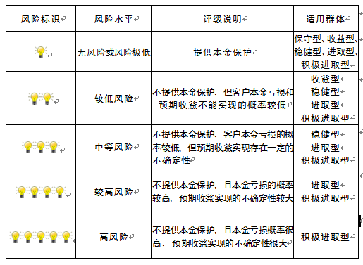 本产品为非保本浮动收益型理财产品,不保证本金和收益,请您充分认识投资风险,谨慎投资。本期产品期限为139天(中国建设银行有权对产品进行展期或提前终止),存续期内,产品不接受申购或赎回申请。本期产品内部风险评级级别为三盏警示灯 ,风险水平属于中等风险。最不利情况下,您将损失全部收益甚至包括全部本金。本理财产品适用于稳健型、进取型 、积极进取型客户。