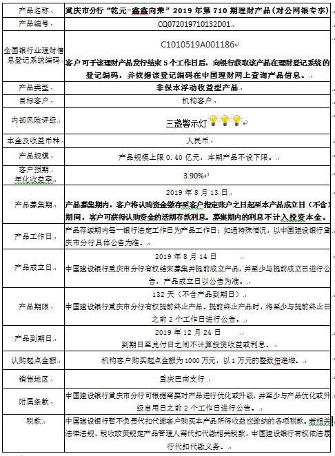 3.中国建设银行重庆市分行可根据市场情况等调整产品规模上、下限,并最迟于调整规模上下限当日进行公告。