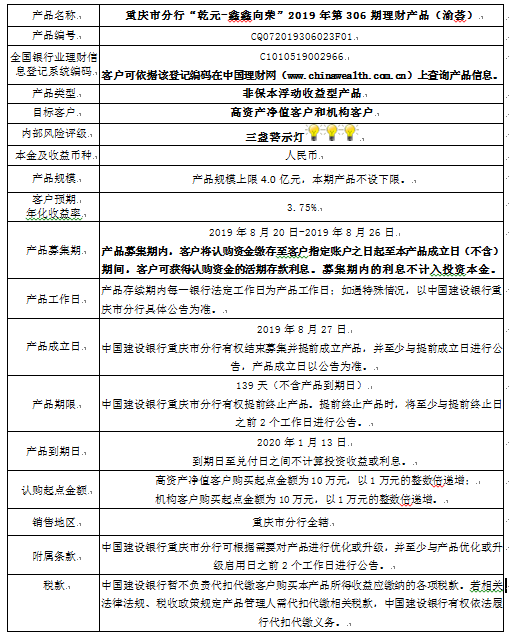 3.中国建设银行重庆市分行可根据市场情况等调整产品规模上、下限,并最迟于调整规模上下限当日进行公告。