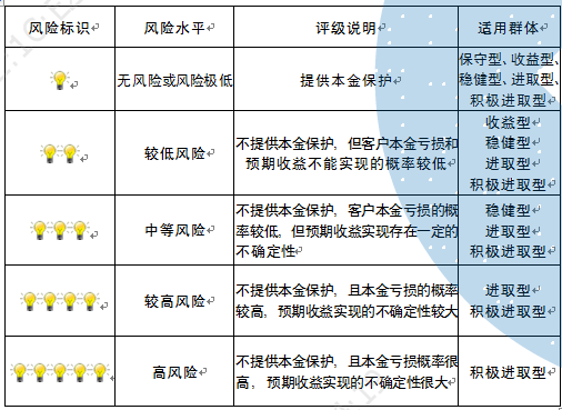 本产品为非保本浮动收益型理财产品,不保证本金和收益,请您充分认识投资风险,谨慎投资。本期产品期限为105天(中国建设银行有权对产品进行展期或提前终止),存续期内,产品不接受申购或赎回申请。本期产品内部风险评级级别为三盏警示灯 ,风险水平属于中等风险。最不利情况下,您将损失全部收益甚至包括全部本金。本理财产品适用于稳健型、进取型 、积极进取型客户。