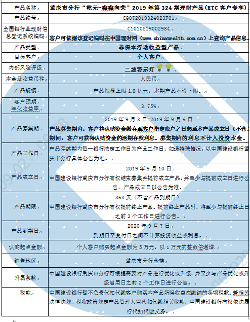 3.中国建设银行重庆市分行可根据市场情况等调整产品规模上、下限,并最迟于调整规模上下限当日进行公告。