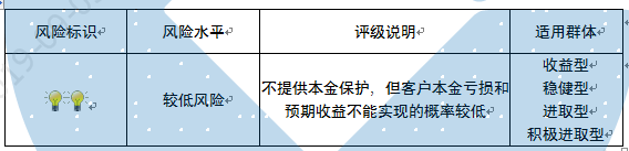 本产品为封闭式净值型理财产品,不保证本金和收益,请您充分认识投资风险,谨慎投资。本产品任何业绩比较基准、测算收益或类似表述均属不具有法律约束力的用语,不代表客户可能获得的实际收益,亦不构成中国建设银行重庆市分行对本产品的任何收益承诺。产品期限为固定期限(中国建设银行重庆市分行有权提前终止产品),存续期内产品不接受赎回申请。 本期产品内部风险评级级别为二盏警示灯 ,风险程度属于较低风险,适用于收益型、稳健型、进取型和积极进取型客户。最不利情况下,本期产品投资的资产无法回收任何本金和净收益,客户将损失全部本金。投资者不得使用贷款、发行债券等筹集的非自有资金投资本产品。如影响您风险承受能力的因素发生变化,请及时完成风险承受能力评估。