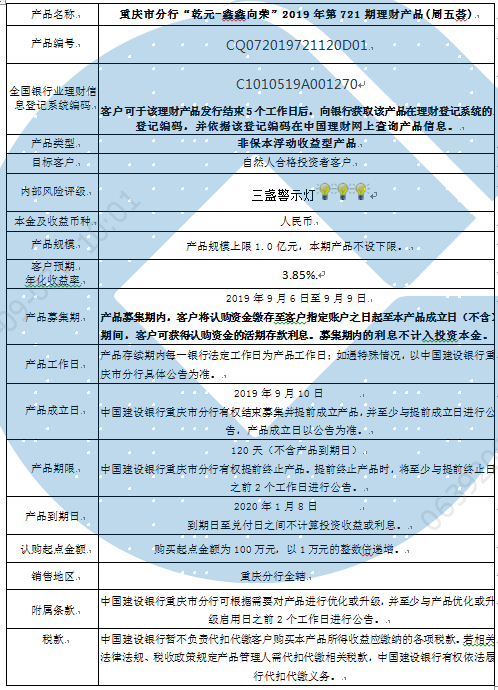 3.中国建设银行重庆市分行可根据市场情况等调整产品规模上、下限,并最迟于调整规模上下限当日进行公告。