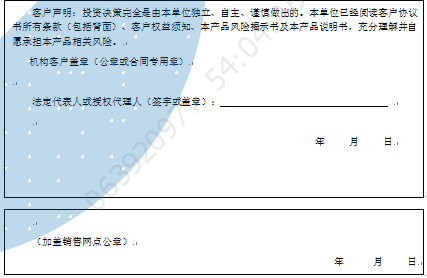 客户签名: ( 客户声明:投资决策完全是由客户独立、自主、谨慎做出的。客户已经阅读客户协议书所有条款(包括背面)、客户权益须知、本产品风险揭示书及本产品说明书,充分理解并自愿承担本产品相关风险。)