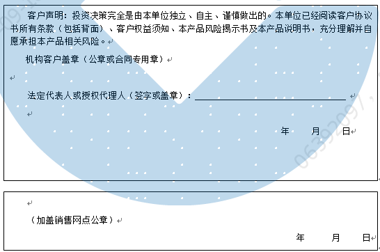 客户签名: ( 客户声明:投资决策完全是由客户独立、自主、谨慎做出的。客户已经阅读客户协议书所有条款(包括背面)、客户权益须知、本产品风险揭示书及本产品说明书,充分理解并自愿承担本产品相关风险。)
