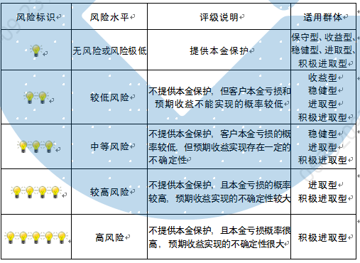 本产品为非保本浮动收益型理财产品,不保证本金和收益,请您充分认识投资风险,谨慎投资。本期产品期限为300天(中国建设银行有权对产品进行展期或提前终止),存续期内,产品不接受申购或赎回申请。本期产品内部风险评级级别为三盏警示灯 ,风险水平属于中等风险。最不利情况下,您将损失全部收益甚至包括全部本金。本理财产品适用于稳健型、进取型 、积极进取型客户。