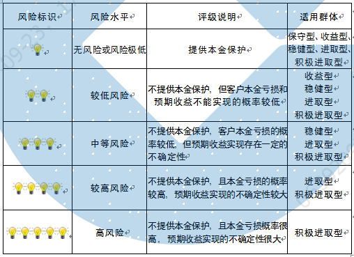 本产品为非保本浮动收益型理财产品,不保证本金和收益,请您充分认识投资风险,谨慎投资。本期产品期限为99天(中国建设银行有权对产品进行展期或提前终止),存续期内,产品不接受申购或赎回申请。本期产品内部风险评级级别为二盏警示灯 ,风险水平属于较低风险。最不利情况下,您将损失全部收益甚至包括全部本金。本理财产品适用于收益型、稳健型、进取型 、积极进取型客户。