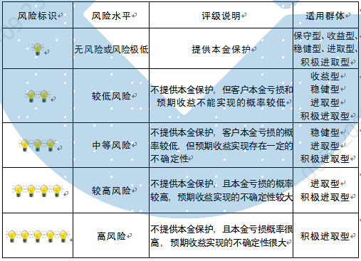本产品为非保本浮动收益型理财产品,不保证本金和收益,请您充分认识投资风险,谨慎投资。本期产品期限为366天(中国建设银行有权对产品进行展期或提前终止),存续期内,产品不接受申购或赎回申请。本期产品内部风险评级级别为三盏警示灯 ,风险水平属于中等风险。最不利情况下,您将损失全部收益甚至包括全部本金。本理财产品适用于稳健型、进取型 、积极进取型客户。