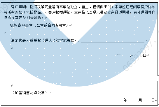 客户签名: ( 客户声明:投资决策完全是由客户独立、自主、谨慎做出的。客户已经阅读客户协议书所有条款(包括背面)、客户权益须知、本产品风险揭示书及本产品说明书,充分理解并自愿承担本产品相关风险。)