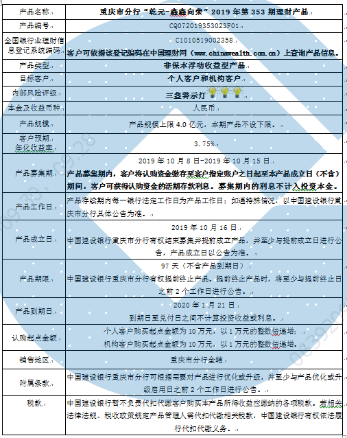 3.中国建设银行重庆市分行可根据市场情况等调整产品规模上、下限,并最迟于调整规模上下限当日进行公告。