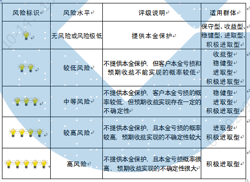 本产品为非保本浮动收益型理财产品,不保证本金和收益,请您充分认识投资风险,谨慎投资。本期产品期限为125天(中国建设银行有权对产品进行展期或提前终止),存续期内,产品不接受申购或赎回申请。本期产品内部风险评级级别为二盏警示灯 ,风险水平属于较低风险。最不利情况下,您将损失全部收益甚至包括全部本金。本理财产品适用于收益型、稳健型、进取型 、积极进取型客户。