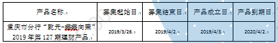 “乾元—鑫鑫向荣” 2019年第127期理财产品于2019年4月3日正式成立。截至报告日,本产品规模为6998万元,杠杆水平符合监管要求。