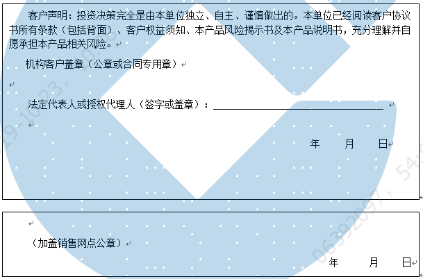 客户签名: ( 客户声明:投资决策完全是由客户独立、自主、谨慎做出的。客户已经阅读客户协议书所有条款(包括背面)、客户权益须知、本产品风险揭示书及本产品说明书,充分理解并自愿承担本产品相关风险。)
