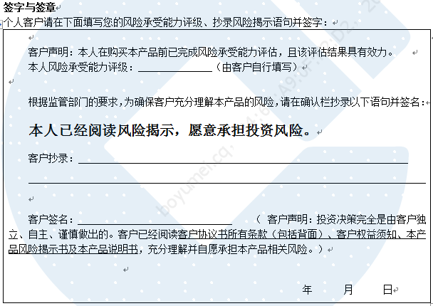您签署本风险揭示书、客户协议书,并将资金委托给中国建设银行重庆市分行运作是您真实的意思表示。本风险揭示书及相应的客户协议书、产品说明书、客户权益须知将共同构成贵我双方理财合同的有效组成部分。