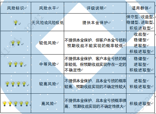 本产品为非保本浮动收益型理财产品,不保证本金和收益,请您充分认识投资风险,谨慎投资。本期产品期限为125天(中国建设银行有权对产品进行展期或提前终止),存续期内,产品不接受申购或赎回申请。本期产品内部风险评级级别为二盏警示灯 ,风险水平属于较低风险。最不利情况下,您将损失全部收益甚至包括全部本金。本理财产品适用于收益型、稳健型、进取型 、积极进取型客户。