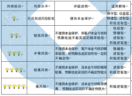 本产品为非保本浮动收益型理财产品,不保证本金和收益,请您充分认识投资风险,谨慎投资。本期产品期限为365天(中国建设银行有权对产品进行展期或提前终止),存续期内,产品不接受申购或赎回申请。本期产品内部风险评级级别为三盏警示灯 ,风险水平属于中等风险。最不利情况下,您将损失全部收益甚至包括全部本金。本理财产品适用于稳健型、进取型 、积极进取型客户。